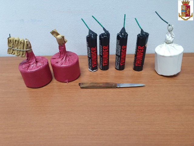 Inoltre, la perquisizione effettuata nell’abitazione del ventiduenne, che è stato trovato in possesso di un coltello a serramanico di genere vietato, ha permesso di rinvenire 3 petardi artigianali tipo “cipolla” e 4 petardi Thunder, motivo per cui è stato denunciato, altresì, per i reati di detenzione illegale di materiale esplodente e di oggetti atti ad offendere.